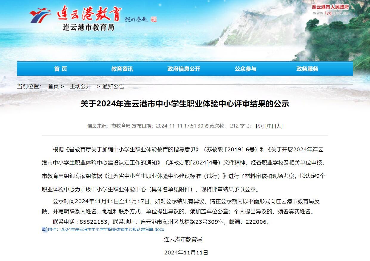 11月11日,连云港市教育局发布《关于2024年连云港市中小学生职业体验中心评审结果的公示》,灌云中专影视制作职业体验中心成功入选市级职业体验中心。
